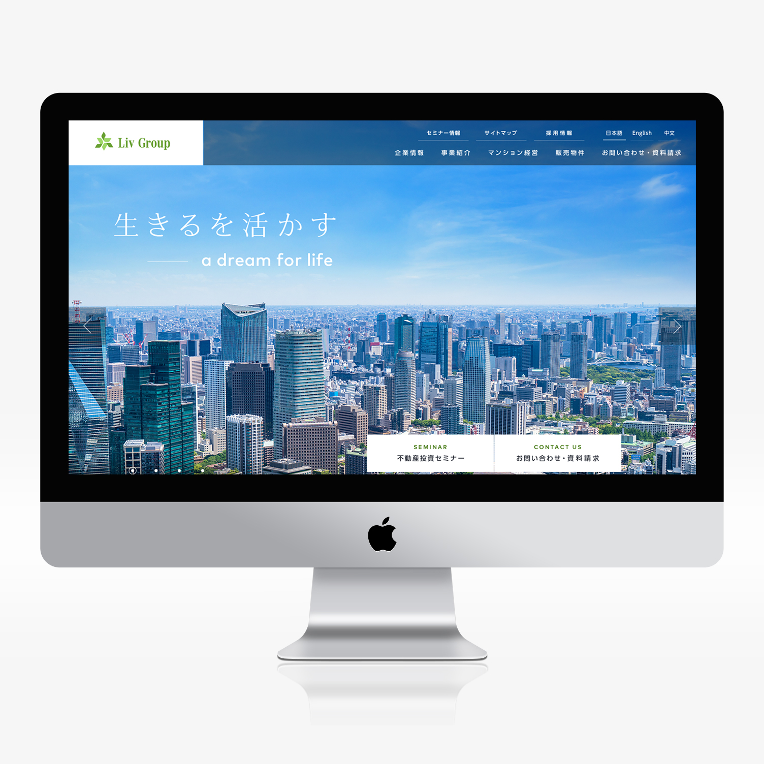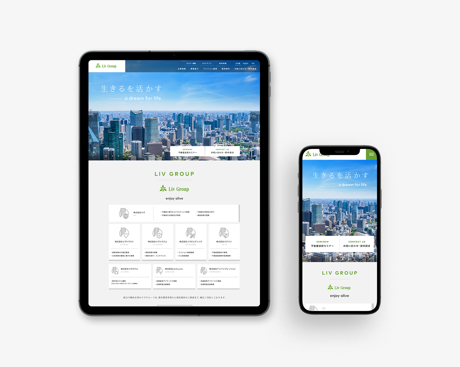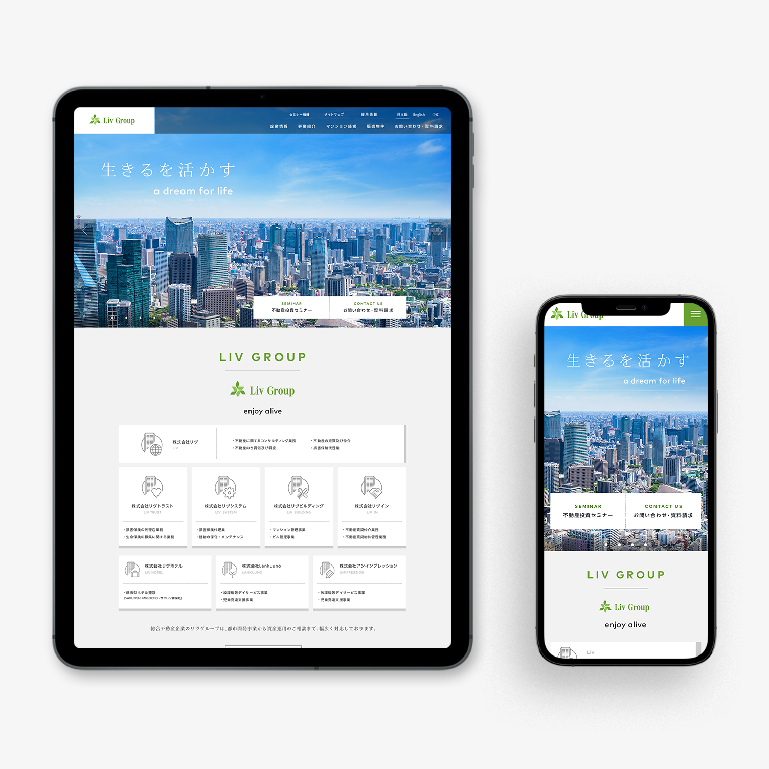 不動産売買を軸にしたグループとしての強さを伝えながら、全体の印象は端正で見やすく保つことも大切にしました。LIV Groupのサイトでは、情報設計とビジュアルデザインの両面から、グループ全体の輪郭を明快に描き出しています。