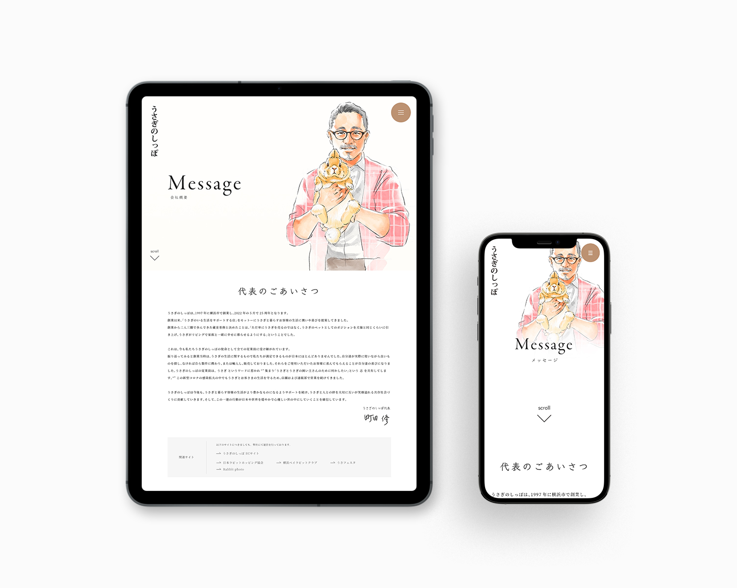 全体のトーンは、うさぎという存在が持つやわらかな印象に寄り添いながら、親しみやすさの中にも清潔感と信頼感が感じられるように設計しました。 色使いや余白、レイアウトのバランスを丁寧に整えることで、過度に装飾的になりすぎない、落ち着いたあたたかさを目指しています。